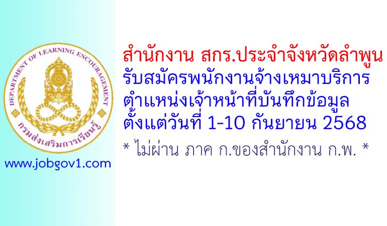 ประกาศสำนักงานส่งเสริมการเรียนรู้ประจำจังหวัดลำพูน เรื่อง รับสมัครบุคคลเพื่อคัดเลือกเป็นพนักงานจ้างเหมาบริการ ตำแหน่ง เจ้าหน้าที่บันทึกข้อมูล