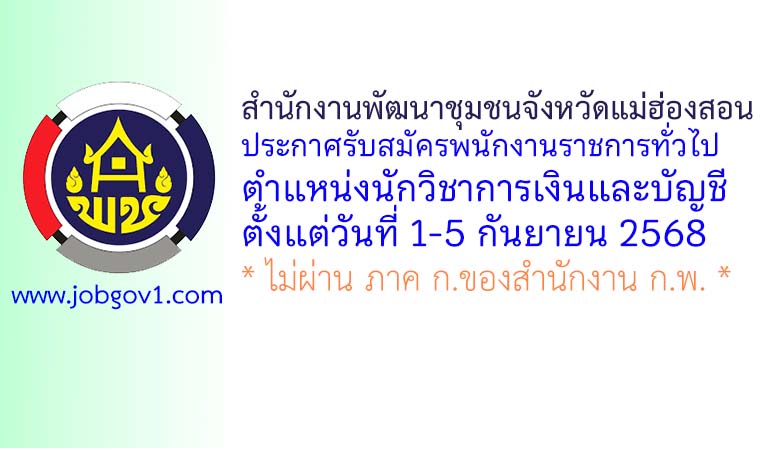 สำนักงานพัฒนาชุมชนจังหวัดแม่ฮ่องสอน รับสมัครพนักงานราชการทั่วไป ตำแหน่งนักวิชาการเงินและบัญชี ตั้งแต่วันที่ 1-5 กันยายน 2568