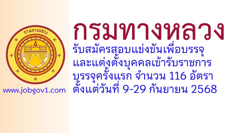 กรมทางหลวง รับสมัครสอบแข่งขันเพื่อบรรจุและแต่งตั้งบุคคลเข้ารับราชการ บรรจุครั้งแรก 116 อัตรา ตั้งแต่วันที่ 9-29 กันยายน 2568