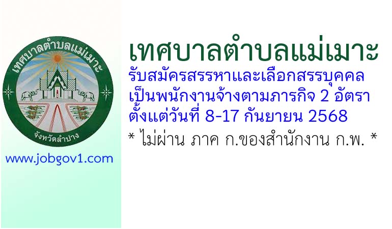 เทศบาลตำบลแม่เมาะ รับสมัครสรรหาและเลือกสรรบุคคลเป็นพนักงานจ้างตามภารกิจ 2 อัตรา ตั้งแต่วันที่ 8-17 กันยายน 2568