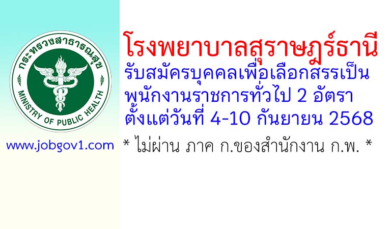 โรงพยาบาลสุราษฎร์ธานี รับสมัครบุคคลเพื่อเลือกสรรเป็นพนักงานราชการทั่วไป 2 อัตรา ตั้งแต่วันที่ 4-10 กันยายน 2568
