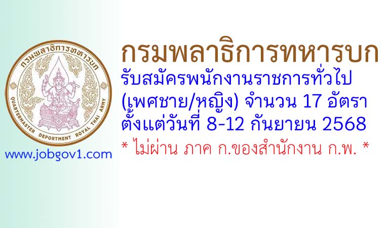 กรมพลาธิการทหารบก รับสมัครพนักงานราชการทั่วไป (เพศชาย/หญิง) 17 อัตรา ตั้งแต่วันที่ 8-12 กันยายน 2568