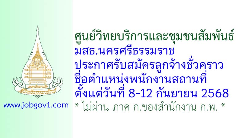 ศูนย์วิทยบริการและชุมชนสัมพันธ์ มสธ.นครศรีธรรมราช รับสมัครลูกจ้างชั่วคราว ตำแหน่งพนักงานสถานที่ ตั้งแต่วันที่ 8-12 กันยายน 2568
