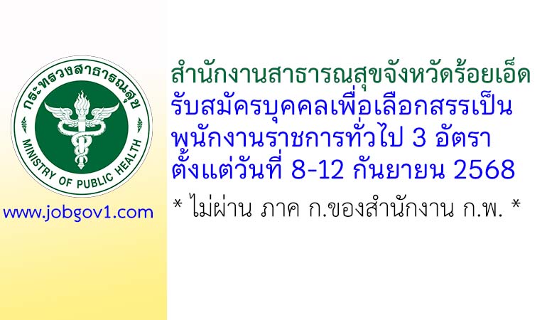 สำนักงานสาธารณสุขจังหวัดร้อยเอ็ด รับสมัครบุคคลเพื่อเลือกสรรเป็นพนักงานราชการทั่วไป 3 อัตรา ตั้งแต่วันที่ 8-12 กันยายน 2568