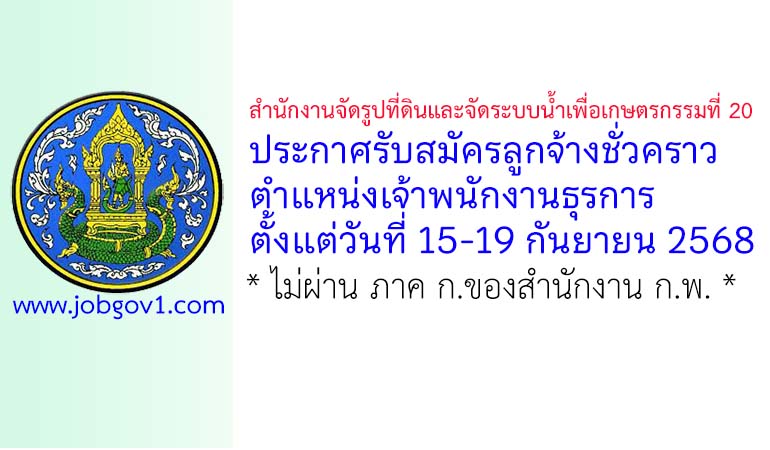 สำนักงานจัดรูปที่ดินและจัดระบบน้ำเพื่อเกษตรกรรมที่ 20 รับสมัครลูกจ้างชั่วคราว ตำแหน่งเจ้าพนักงานธุรการ ตั้งแต่วันที่ 15-19 กันยายน 2568