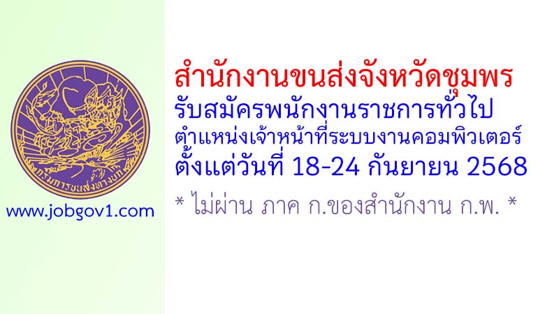 สำนักงานขนส่งจังหวัดชุมพร รับสมัครพนักงานราชการทั่วไป ตำแหน่งเจ้าหน้าที่ระบบงานคอมพิวเตอร์ ตั้งแต่วันที่ 18-24 กันยายน 2568