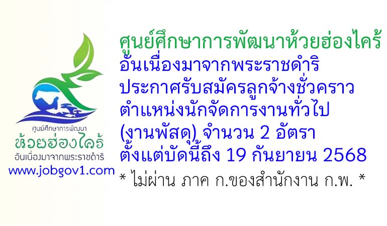 ศูนย์ศึกษาการพัฒนาห้วยฮ่องไคร้อันเนื่องมาจากพระราชดำริ รับสมัครลูกจ้างชั่วคราว ตำแหน่งนักจัดการงานทั่วไป (งานพัสดุ) 2 อัตรา ตั้งแต่บัดนี้ถึง 19 กันยายน 2568