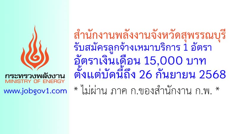 สำนักงานพลังงานจังหวัดสุพรรณบุรี รับสมัครลูกจ้างเหมาบริการ จำนวน 1 อัตรา ตั้งแต่บัดนี้ถึง 26 กันยายน 2568