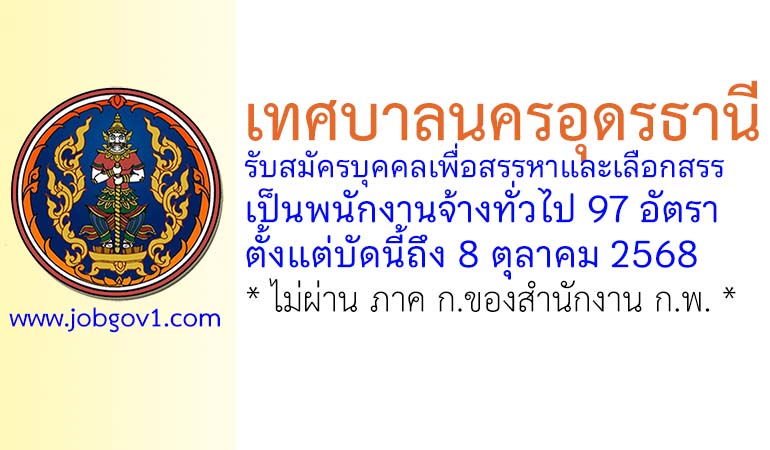 เทศบาลนครอุดรธานี รับสมัครบุคคลเพื่อสรรหาและเลือกสรรเป็นพนักงานจ้างทั่วไป 97 อัตรา ตั้งแต่บัดนี้ถึง 8 ตุลาคม 2568