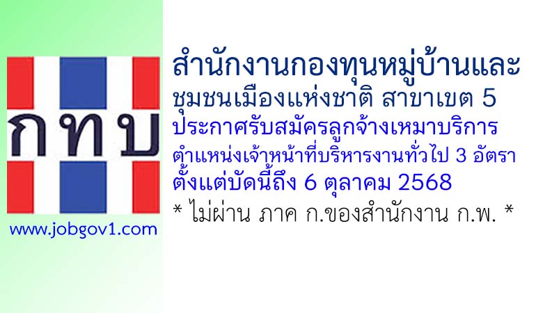 สำนักงานกองทุนหมู่บ้านและชุมชนเมืองแห่งชาติ สาขาเขต 5 รับสมัครลูกจ้างเหมาบริการ 3 อัตรา ตั้งแต่บัดนี้ถึง 6 ตุลาคม 2568