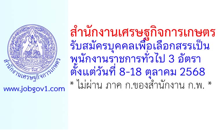 สำนักงานเศรษฐกิจการเกษตร รับสมัครบุคคลเพื่อเลือกสรรเป็นพนักงานราชการทั่วไป 3 อัตรา ตั้งแต่วันที่ 8-18 ตุลาคม 2568