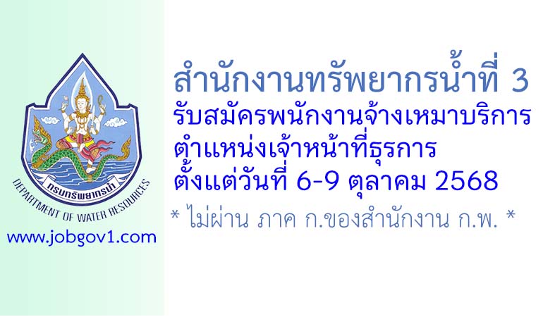 สำนักงานทรัพยากรน้ำที่ 3 รับสมัครพนักงานจ้างเหมาบริการ ตำแหน่งเจ้าหน้าที่ธุรการ ตั้งแต่วันที่ 6-9 ตุลาคม 2568