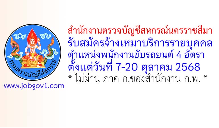 สำนักงานตรวจบัญชีสหกรณ์นครราชสีมา รับสมัครจ้างเหมาบริการรายบุคคล ตำแหน่งพนักงานขับรถยนต์ 4 อัตรา ตั้งแต่วันที่ 7-20 ตุลาคม 2568
