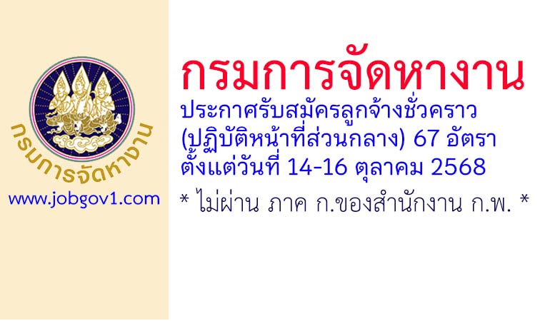 กรมการจัดหางาน รับสมัครลูกจ้างชั่วคราว (ปฏิบัติหน้าที่ส่วนกลาง) 67 อัตรา ตั้งแต่วันที่ 14-16 ตุลาคม 2568