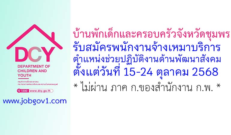 บ้านพักเด็กและครอบครัวจังหวัดชุมพร รับสมัครพนักงานจ้างเหมาบริการ ตำแหน่งช่วยปฏิบัติงานด้านพัฒนาสังคม ตั้งแต่วันที่ 15-24 ตุลาคม 2568