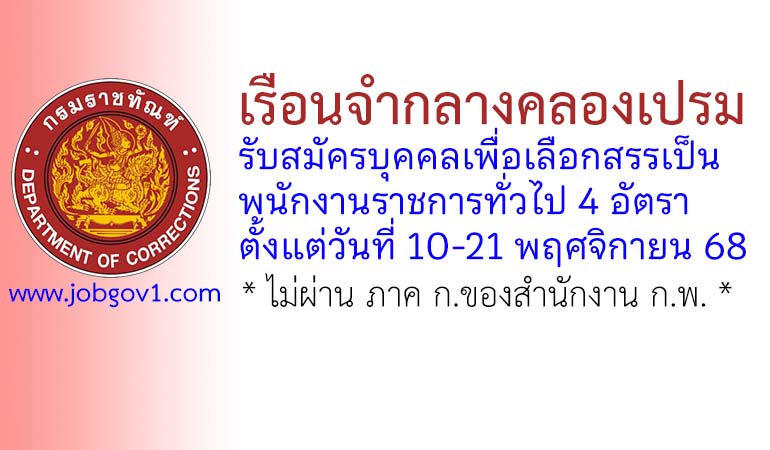 เรือนจำกลางคลองเปรม รับสมัครบุคคลเพื่อเลือกสรรเป็นพนักงานราชการทั่วไป 4 อัตรา ตั้งแต่วันที่ 10-21 พฤศจิกายน 2568