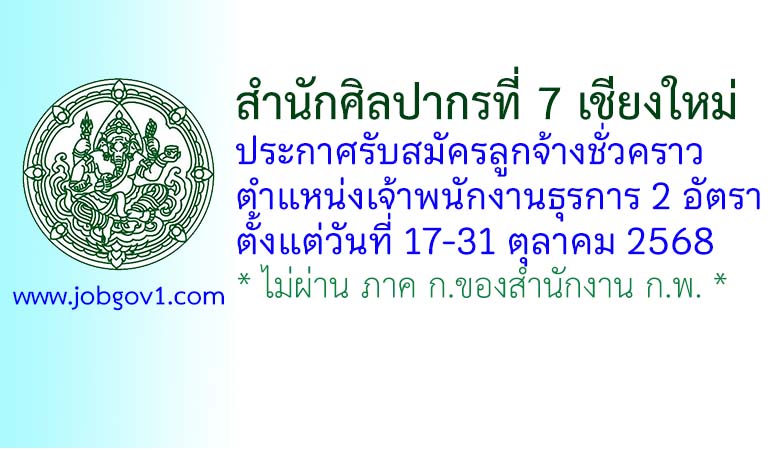 สำนักศิลปากรที่ 7 เชียงใหม่ รับสมัครลูกจ้างชั่วคราว ตำแหน่งเจ้าพนักงานธุรการ 2 อัตรา ตั้งแต่วันที่ 17-31 ตุลาคม 2568
