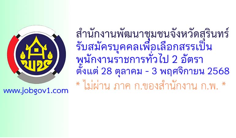 สำนักงานพัฒนาชุมชนจังหวัดสุรินทร์ รับสมัครบุคคลเพื่อเลือกสรรเป็นพนักงานราชการทั่วไป 2 อัตรา ตั้งแต่ 28 ตุลาคม – 3 พฤศจิกายน 2568