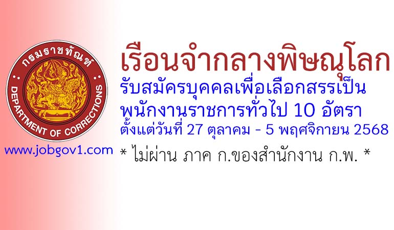 เรือนจำกลางพิษณุโลก รับสมัครบุคคลเพื่อเลือกสรรเป็นพนักงานราชการทั่วไป 10 อัตรา ตั้งแต่วันที่ 27 ตุลาคม – 5 พฤศจิกายน 2568