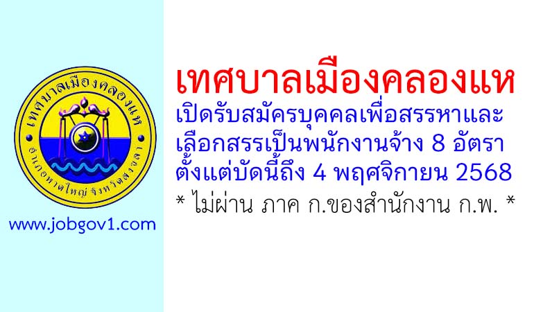 เทศบาลเมืองคลองแห รับสมัครบุคคลเพื่อสรรหาและเลือกสรรเป็นพนักงานจ้าง 8 อัตรา ตั้งแต่บัดนี้ถึง 4 พฤศจิกายน 2568