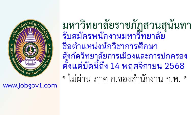 มหาวิทยาลัยราชภัฏสวนสุนันทา รับสมัครพนักงานมหาวิทยาลัย ตำแหน่งนักวิชาการศึกษา สังกัดวิทยาลัยการเมืองและการปกครอง ตั้งแต่บัดนี้ถึง 14 พฤศจิกายน 2568