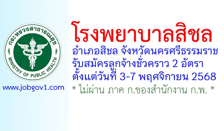 โรงพยาบาลสิชล รับสมัครลูกจ้างชั่วคราว 2 อัตรา ตั้งแต่วันที่ 3-7 พฤศจิกายน 2568