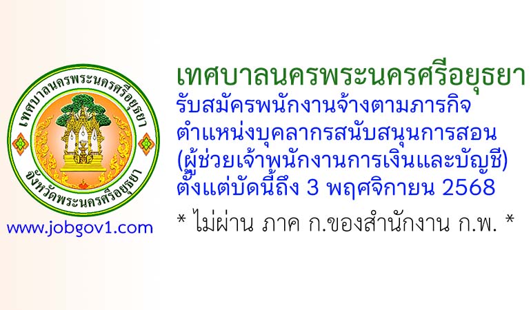 เทศบาลนครพระนครศรีอยุธยา รับสมัครพนักงานจ้างตามภารกิจ ตำแหน่งบุคลากรสนับสนุนการสอน (ผู้ช่วยเจ้าพนักงานการเงินและบัญชี) ตั้งแต่บัดนี้ถึง 3 พฤศจิกายน 2568