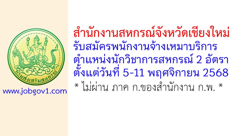 สำนักงานสหกรณ์จังหวัดเชียงใหม่ รับสมัครพนักงานจ้างเหมาบริการ ตำแหน่งนักวิชาการสหกรณ์ 2 อัตรา ตั้งแต่วันที่ 5-11 พฤศจิกายน 2568
