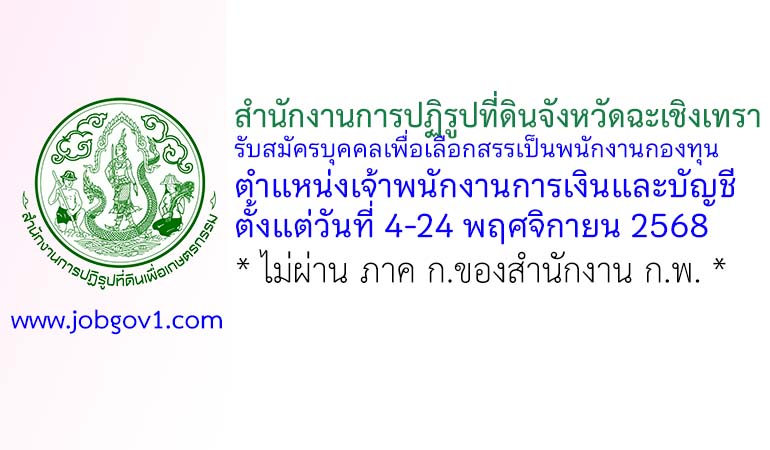 ประกาศจังหวัดฉะเชิงเทรา เรื่อง รับสมัครบุคคลเพื่อเลือกสรรเป็นพนักงานกองทุนการปฏิรูปที่ดินเพื่อเกษตรกรรม ตำแหน่งเจ้าพนักงานการเงินและบัญชี สังกัดสำนักงานการปฏิรูปที่ดินจังหวัดฉะเชิงเทรา