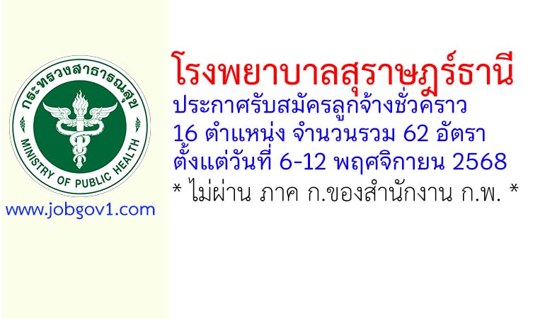 โรงพยาบาลสุราษฎร์ธานี รับสมัครลูกจ้างชั่วคราว 62 อัตรา ตั้งแต่วันที่ 6-12 พฤศจิกายน 2568