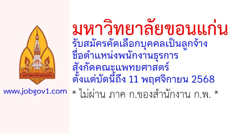 มหาวิทยาลัยขอนแก่น รับสมัครคัดเลือกบุคคลเป็นลูกจ้าง ตำแหน่งพนักงานธุรการ สังกัดคณะแพทยศาสตร์ ตั้งแต่บัดนี้ถึง 11 พฤศจิกายน 2568