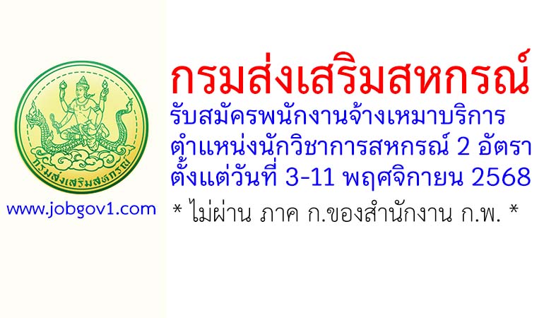 กรมส่งเสริมสหกรณ์ รับสมัครพนักงานจ้างเหมาบริการ ตำแหน่งนักวิชาการสหกรณ์ 2 อัตรา ตั้งแต่วันที่ 3-11 พฤศจิกายน 2568