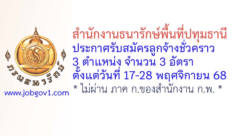 สำนักงานธนารักษ์พื้นที่ปทุมธานี รับสมัครลูกจ้างชั่วคราว 3 อัตรา ตั้งแต่วันที่ 17-28 พฤศจิกายน 2568
