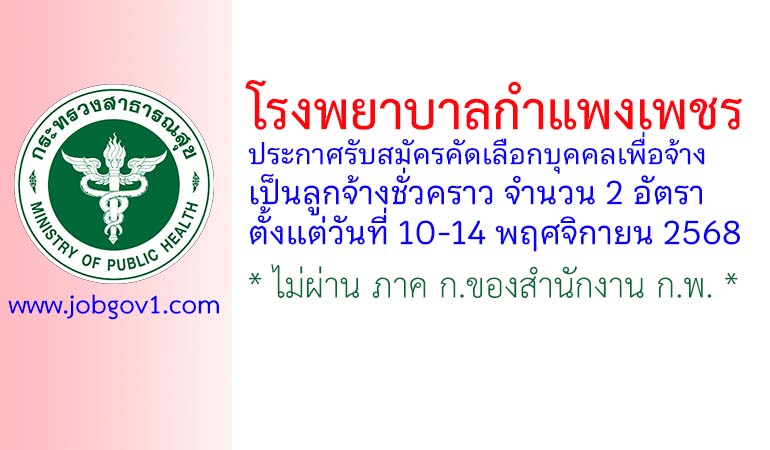 โรงพยาบาลกำแพงเพชร รับสมัครคัดเลือกบุคคลเพื่อจ้างเป็นลูกจ้างชั่วคราว 2 อัตรา ตั้งแต่วันที่ 10-14 พฤศจิกายน 2568