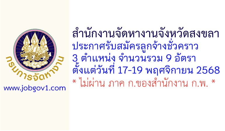 สำนักงานจัดหางานจังหวัดสงขลา รับสมัครลูกจ้างชั่วคราว 9 อัตรา ตั้งแต่วันที่ 17-19 พฤศจิกายน 2568