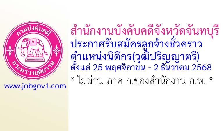 สำนักงานบังคับคดีจังหวัดจันทบุรี รับสมัครลูกจ้างชั่วคราว ตำแหน่งนิติกร(วุฒิปริญญาตรี) ตั้งแต่ 25 พฤศจิกายน – 2 ธันวาคม 2568