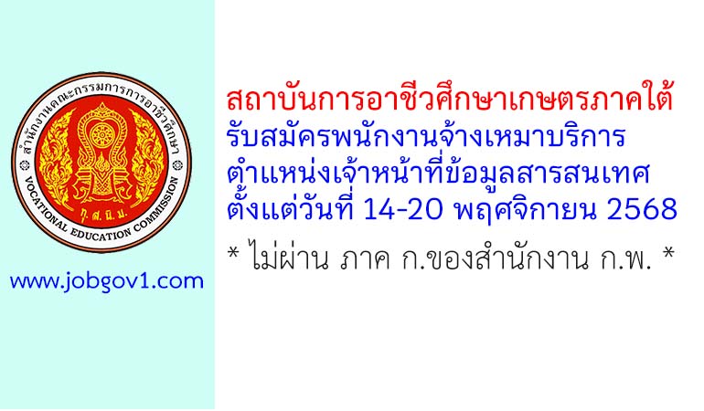 สถาบันการอาชีวศึกษาเกษตรภาคใต้ รับสมัครพนักงานจ้างเหมาบริการ ตำแหน่งเจ้าหน้าที่ข้อมูลสารสนเทศ ตั้งแต่วันที่ 14-20 พฤศจิกายน 2568