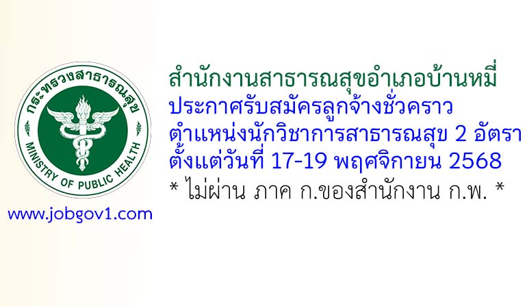 สำนักงานสาธารณสุขอำเภอบ้านหมี่ รับสมัครลูกจ้างชั่วคราว ตำแหน่งนักวิชาการสาธารณสุข 2 อัตรา ตั้งแต่วันที่ 17-19 พฤศจิกายน 2568