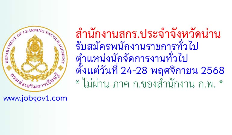 ประกาศสำนักงานส่งเสริมการเรียนรู้ประจำจังหวัดน่าน เรื่อง รับสมัครบุคคลเพื่อสรรหาและเลือกสรรเป็นพนักงานราชการทั่วไป
