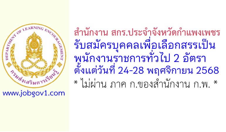 ประกาศสำนักงานส่งเสริมการเรียนรู้ประจำจังหวัดกำแพงเพชร เรื่อง รับสมัครบุคคลเพื่อสรรหาและเลือกสรรเป็นพนักงานราชการทั่วไป