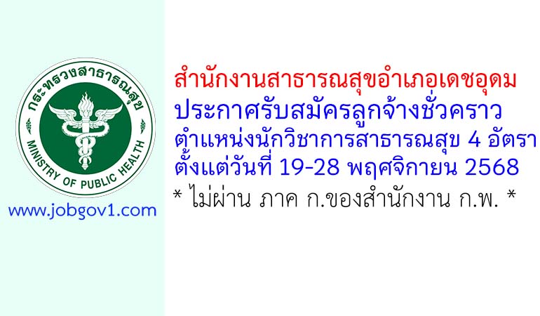 สำนักงานสาธารณสุขอำเภอเดชอุดม รับสมัครลูกจ้างชั่วคราว ตำแหน่งนักวิชาการสาธารณสุข 4 อัตรา ตั้งแต่วันที่ 19-28 พฤศจิกายน 2568