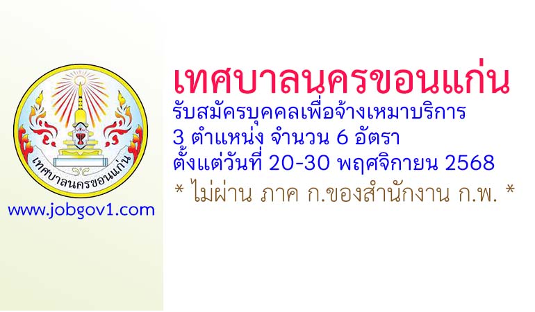 เทศบาลนครขอนแก่น รับสมัครบุคคลเพื่อจ้างเหมาบริการ 6 อัตรา ตั้งแต่วันที่ 20-30 พฤศจิกายน 2568