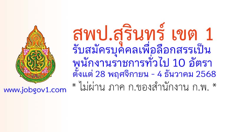 สพป.สุรินทร์ เขต 1 รับสมัครบุคคลเพื่อเลือกสรรเป็นพนักงานราชการทั่วไป 10 อัตรา ตั้งแต่ 28 พฤศจิกายน – 4 ธันวาคม 2568
