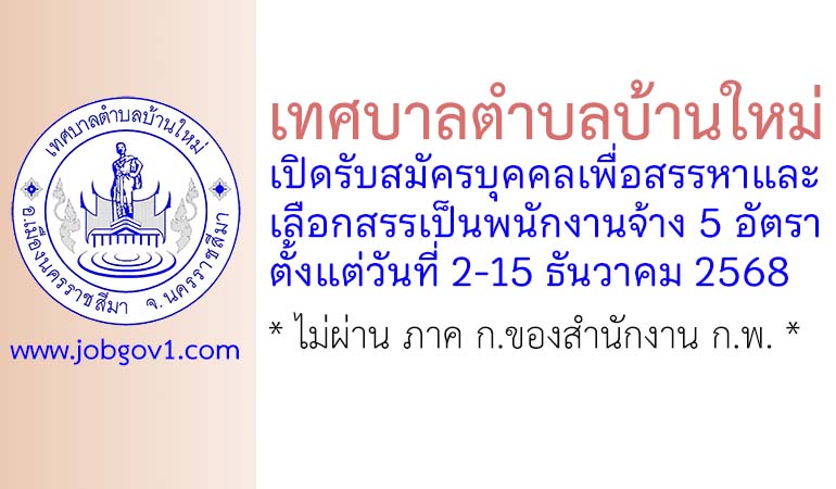 เทศบาลตำบลบ้านใหม่ รับสมัครบุคคลเพื่อสรรหาและเลือกสรรเป็นพนักงานจ้าง 5 อัตรา ตั้งแต่วันที่ 2-15 ธันวาคม 2568