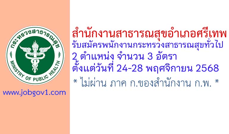 สำนักงานสาธารณสุขอำเภอศรีเทพ รับสมัครพนักงานกระทรวงสาธารณสุขทั่วไป 3 อัตรา ตั้งแต่วันที่ 24-28 พฤศจิกายน 2568
