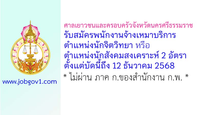 ศาลเยาวชนและครอบครัวจังหวัดนครศรีธรรมราช รับสมัครพนักงานจ้างเหมาบริการ ตำแหน่งนักจิตวิทยาหรือนักสังคมสงเคราะห์ 2 อัตรา ตั้งแต่บัดนี้ถึง 12 ธันวาคม 2568
