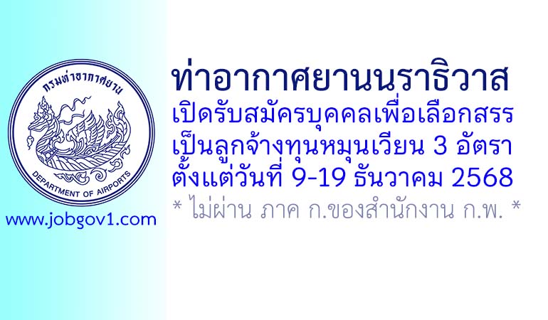 ท่าอากาศยานนราธิวาส รับสมัครบุคคลเพื่อเลือกสรรเป็นลูกจ้างทุนหมุนเวียน 3 อัตรา ตั้งแต่วันที่ 9-19 ธันวาคม 2568