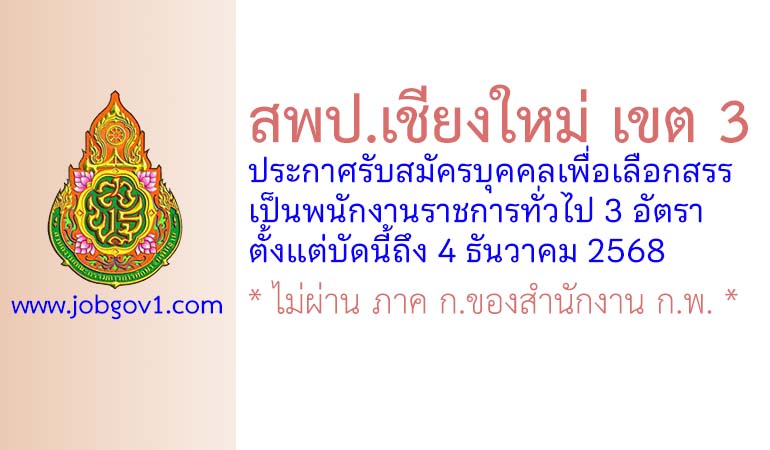 สพป.เชียงใหม่ เขต 3 รับสมัครบุคคลเพื่อเลือกสรรเป็นพนักงานราชการทั่วไป 3 อัตรา ตั้งแต่บัดนี้ถึง 4 ธันวาคม 2568