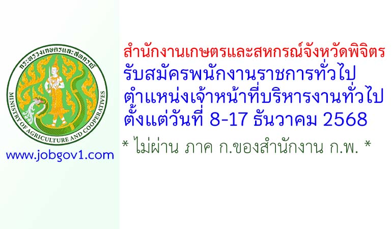 สำนักงานเกษตรและสหกรณ์จังหวัดพิจิตร รับสมัครพนักงานราชการทั่วไป ตำแหน่งเจ้าหน้าที่บริหารงานทั่วไป ตั้งแต่วันที่ 8-17 ธันวาคม 2568