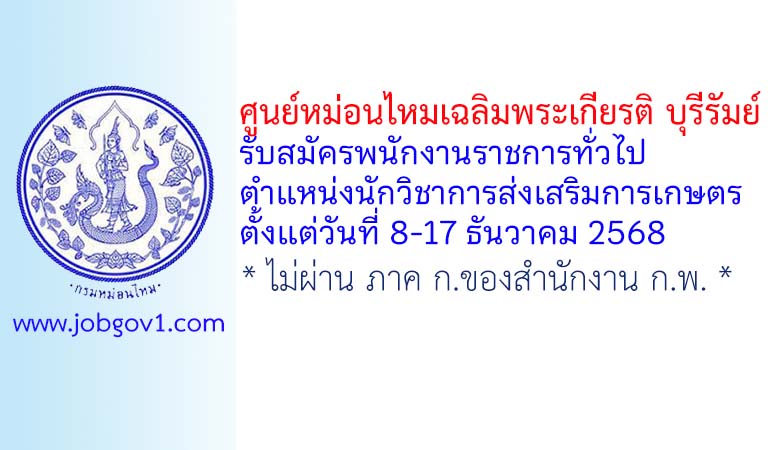 ศูนย์หม่อนไหมเฉลิมพระเกียรติ บุรีรัมย์ รับสมัครพนักงานราชการทั่วไป ตำแหน่งนักวิชาการส่งเสริมการเกษตร ตั้งแต่วันที่ 8-17 ธันวาคม 2568